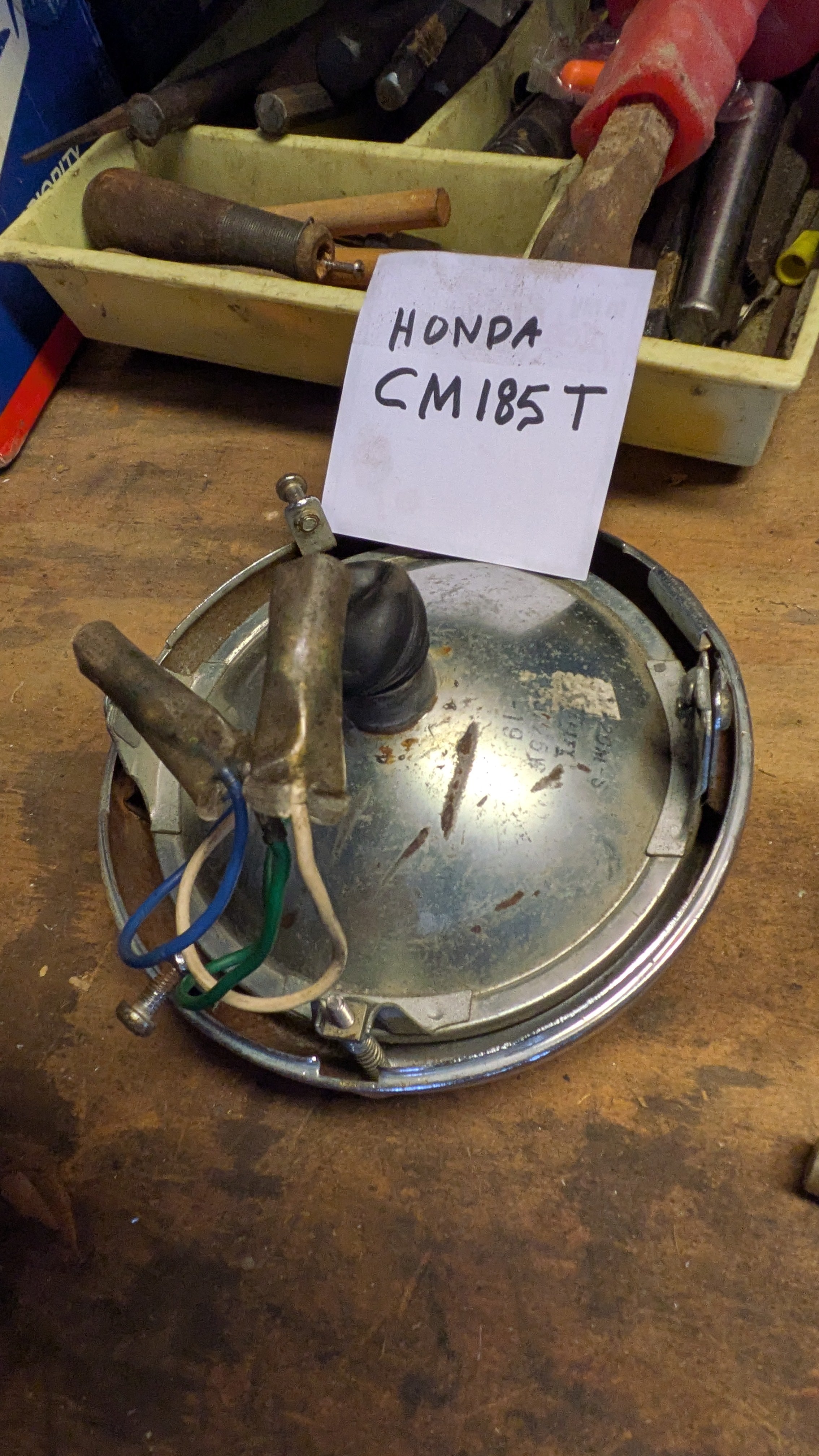 Taken from a CM185T. Shell, Ring, and all installation bolts/screws adjustment screws complete. The bulb(Stanley 6-1720) does not appear to be functional but all factory wiring is there. It can be removed and a more modern bulb installed. Chrome is good with a little rust underneath.